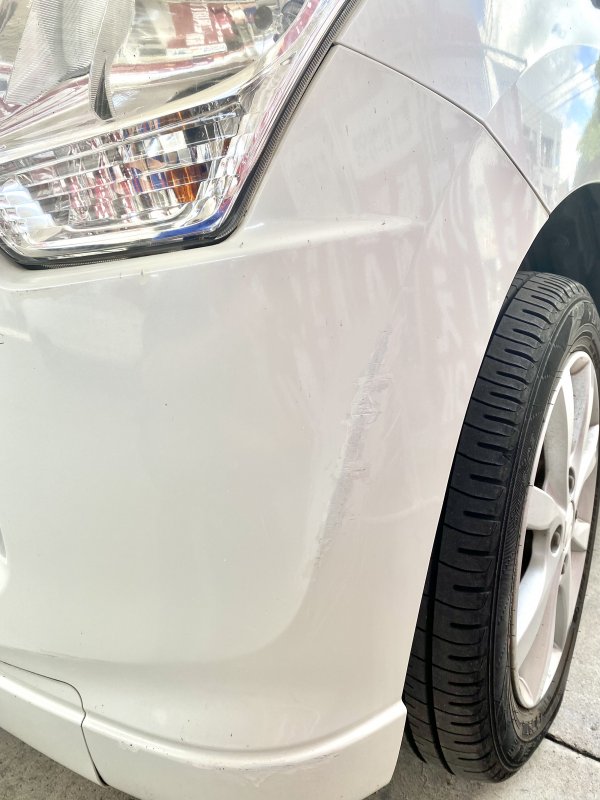 フロントバンパーを縁石ブロックなどに当ててしまい気になるスリキズ損傷が出来たため、修理のご相談でご来店を頂きました。