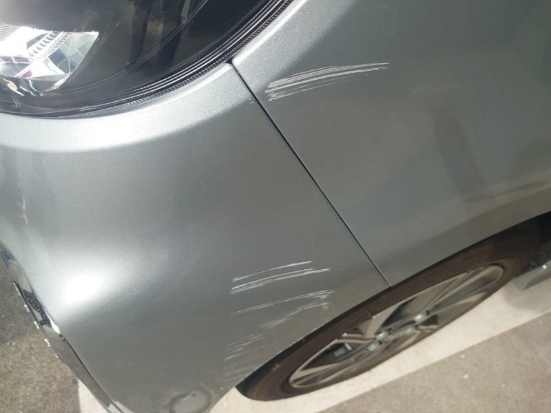 助手席側のフロントバンパーとフロントフェンダーをハンドル操作を誤り大きなスリキズができてしまい修理のご相談でご来店頂きました。