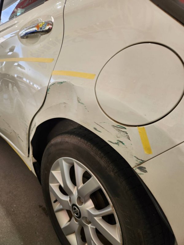 鹿児島県鹿屋市|ノート(日産)のキズ・へこみ直し事例(①運転席側リアドア ②運転席側リアフェンダー)