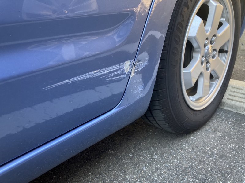 お客様が左折時に壁に接触してキズとヘコミが発生。当店のホームページを見てご来店頂き修理のご依頼を頂きました。