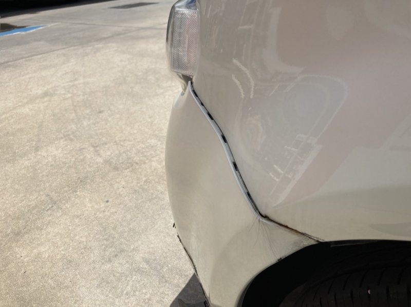 フロントバンパーは端部の下半分が大きく凹んでおり、修正ではひずみが残ってしまう可能性が高くお客様と打ち合わせして交換致しました。