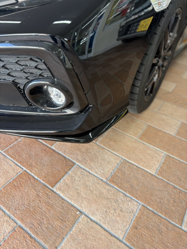 バンパーとリップスポイラーの取付部分を少し外しヒートガンを使い、損傷個所の裏から凹んだ場所を押し出す事により元の形を再現致しました。パテやサーフェーサーで形を整え塗装をする事により修理が完了致しました。
