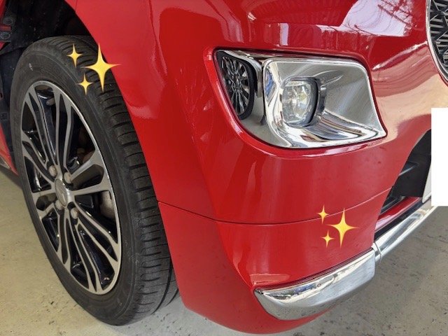 写真にあるように、フロントバンパーの右側に付いてしまった傷を鈑金塗装でお直しさせていただきました✨✨