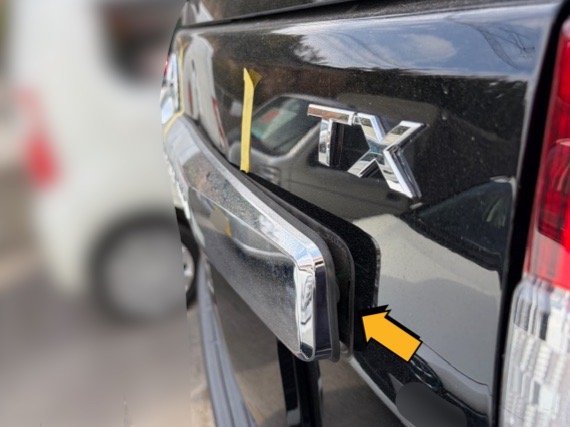 バックドアのへこみを鈑金塗装でお直しして、バックドアガーニッシュ(横長のメッキ部品)は割れなどがあり再利用ができないため、新品と取替させていただきました✨✨