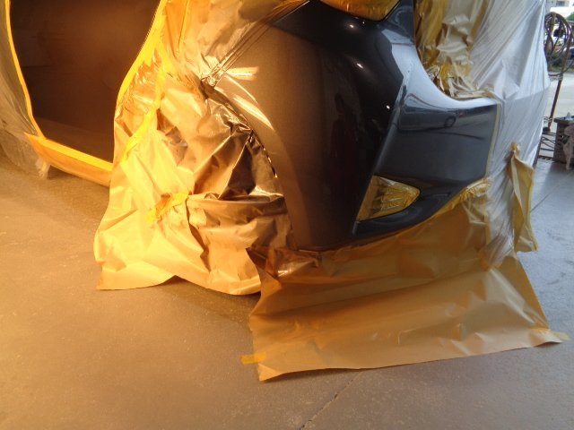よくあるバンパーのキズ修理です。色の違和感を出さない為に、意外と広い範囲の塗装を行なっている事がご覧いただけると思います。