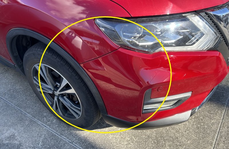 日産 エクストレイル フロントバンパー フロントフェンダー 修理 板金 塗装 傷へこみ直し 岡山 学南町 岡大前