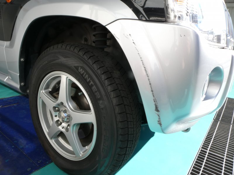 三菱パジェロミニ クールシルバーメタリック/ブラックマイカのキズ・へこみ直し事例(フロントバンパー右コーナーをブロック塀に接触し、損傷させてしまった)神奈川県横浜市保土ケ谷区