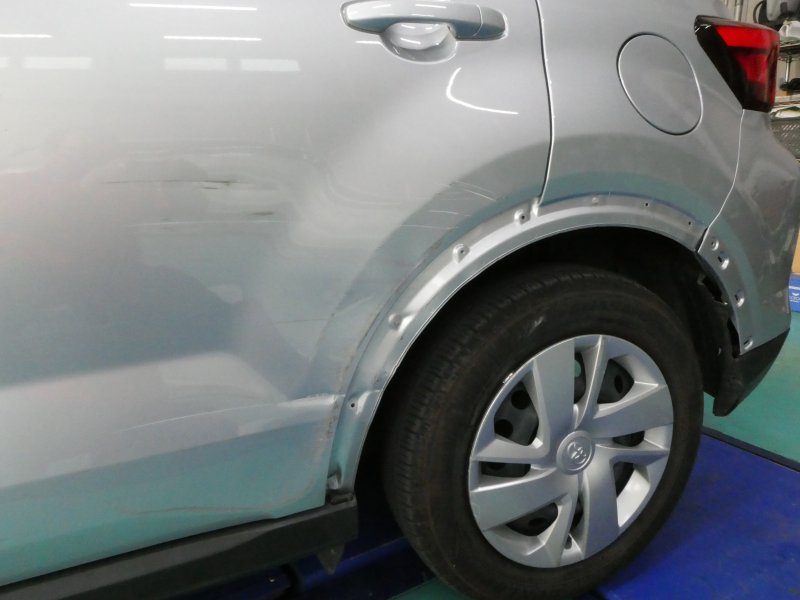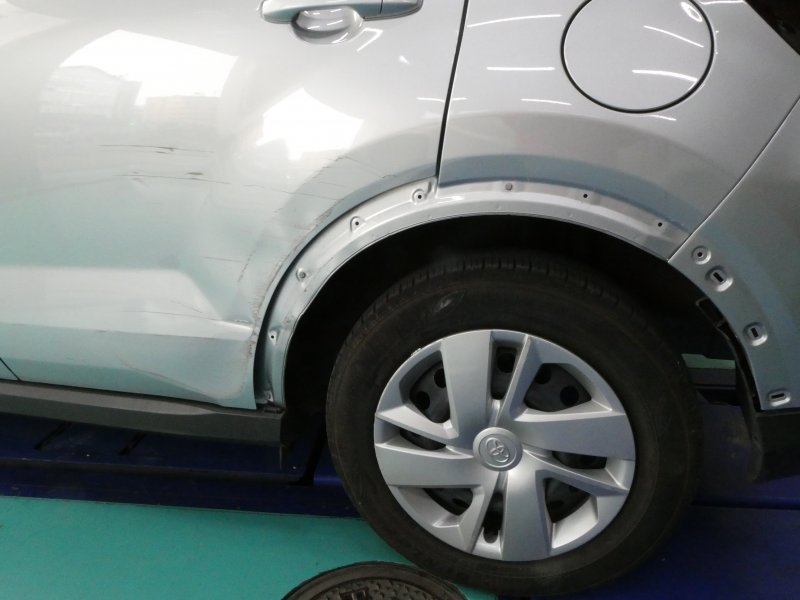 ライズ ブライトシルバーメタリック(トヨタ)のキズ・へこみ直し事例(左リヤドアとリヤフェンダーを鉄柱にあて、大きく損傷)神奈川県横浜市保土ケ谷区