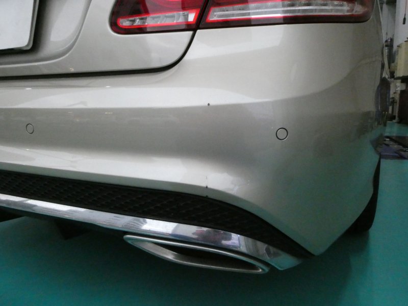 Eクラス ライトゴールド(メルセデス・ベンツ)のキズ・へこみ直し事例(リヤバンパーをブロック塀に当て、損傷)神奈川県横浜市保土ケ谷区|