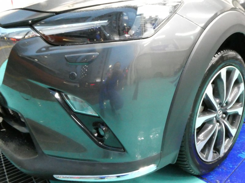 CX-3 マシーングレーメテリック(マツダ)のキズ・へこみ直し事例(フロントバンパー左側と左フロントフェンダーを鉄柱に接触させ損傷)神奈川県横浜市保土ケ谷区