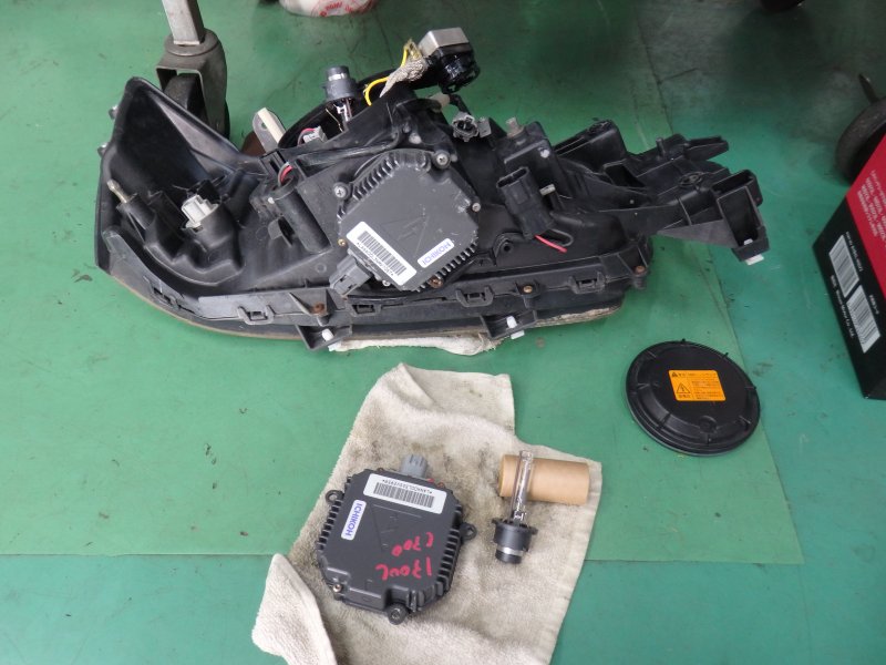 今回の作業において、一番の問題はHIDのヘッドライトが片目だけ不点灯。ヘッドライトの中に水もたまっている事からライトの脱着。HIDバラストはコストの面から中古を使用しバーナーである球は社外新品の安価な球で交換。