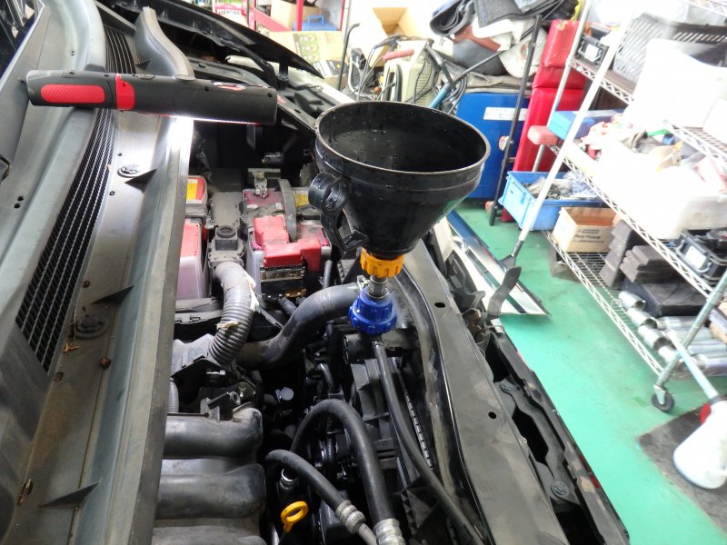 点検によりクーリングファンモーターの回転不良と判明。ファンが回らないため、エアコンも利かず、ラジエターも冷やされないためオーバーヒート気味にもなっていた。安価に治したいとのことで社外モーターを探し対応。車両からシュラウドだけを引き抜き、モーターを単体交換、LLCを補充し作業終了。