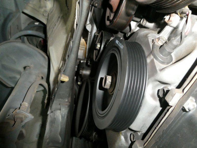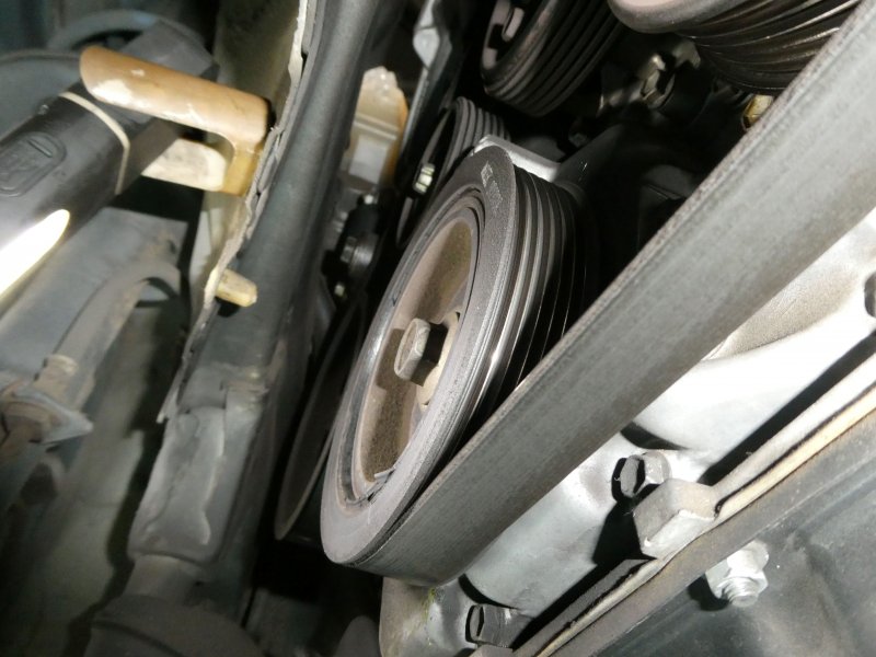 ベルトの調整で治るかとボンネットを開けると、オート調整の為調整が利かず、ベルト全体を見ながら下のクランクに目をやると、クランクプーリーが少々斜めになっていた。