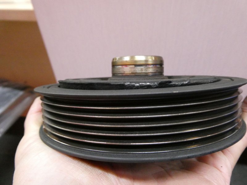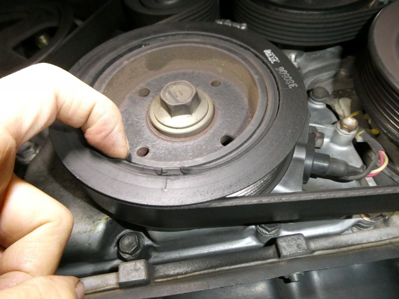 エンジンを回しベルトの振れを確認。プーリーのダンパー剥がれにより、ベルトとクランクプーリーの交換を指摘。今回は、新品部品の在庫がまだあったので治るが、この年式は部品製造廃止になっているものも有る。