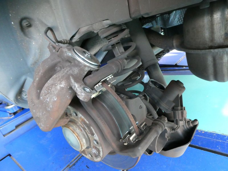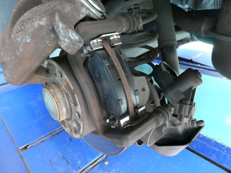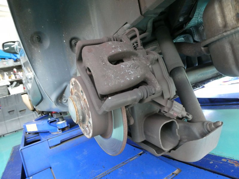 リアブレーキパッドの交換作業を受注。なお、コストを安く抑えたいご希望により、社外部品にて準備。サイドブレーキには電子ブレーキを採用されているお車のため、本来なら診断器にて解除を入力しパッド交換となるが、今回は診断器を使わずに行ってみた。