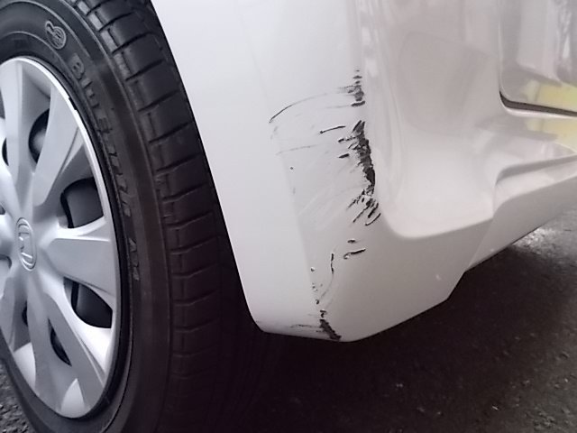 リアバンパーを傷つけてしまったと申告が御座いました。写真で見て頂くとキズでバンパー削れてしまっているのがよくわかります。完成後では傷の無かった時の状態になっております。作業も1日にて対応をしております。