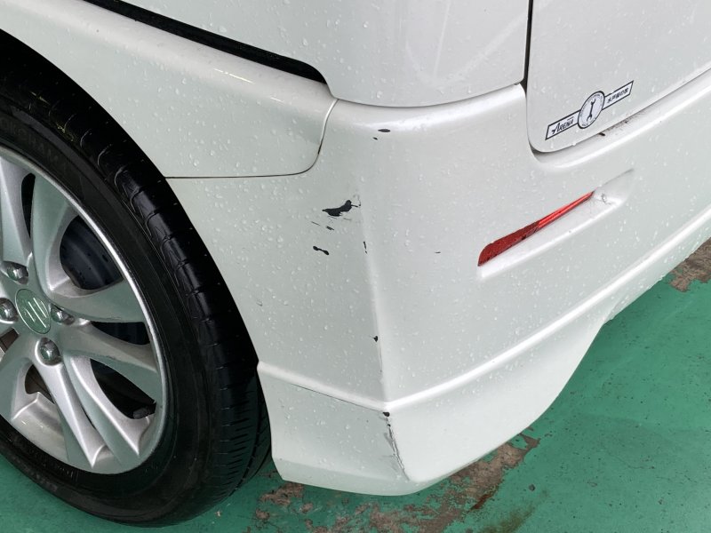 【茨城県 ひたちなか市 水戸市 大洗町】日産・ピノ、S、平成21年9月、DBA-HC24S、リヤバンパー(リサイクル部品交換 多色要塗装)、リヤゲート(バックドア)キズ・ヘコミ修理作業事例、リヤバンパー擦れキズすり傷修理修復、バンパー変形修理、リサイクル部品使用修理、なるべく安く直す、修理費用を抑えたい、リビルトパーツ使用、新品交換したくない、高額見積が出ている、最安値、最短修理日数時間、代車無料