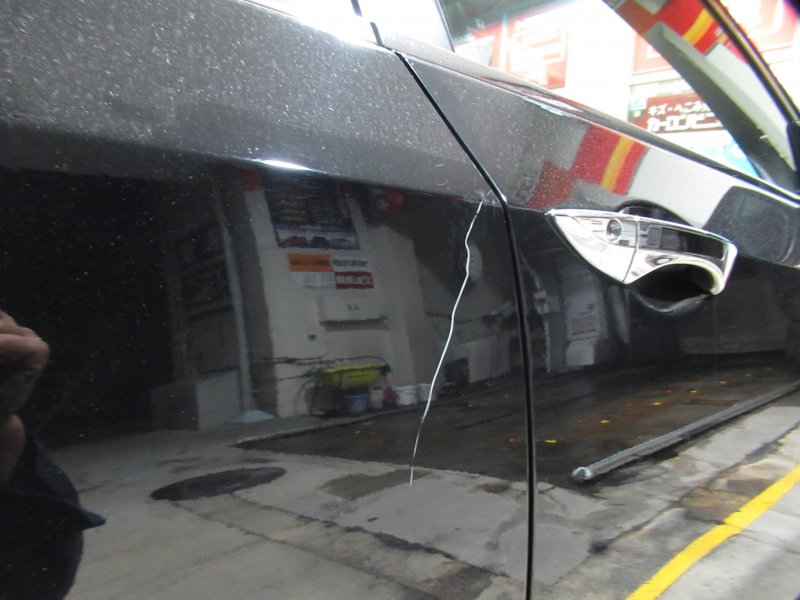 イタズラ?いつの間にかついていたそうです。写真ではわかりづらいですが、かなりへこんでいます。かなり力が入っているようなキズでした。自分でつけたキズじゃないので、なるべく安く仕上げたいとの事だったので、安くキレイに仕上がる当店自慢のリペア修理を提案させて頂き、施工させて頂きました。