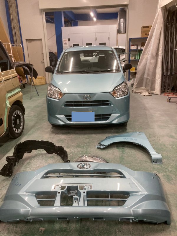 ダイハツミライース・ヘッドライト・フロントバンパー・フロントフェンダー・フロントドア修理になります。画像ではフロント部分の画像ですがフロントドアが、衝撃で押されてしまい、フロントドアの修理も行いました。