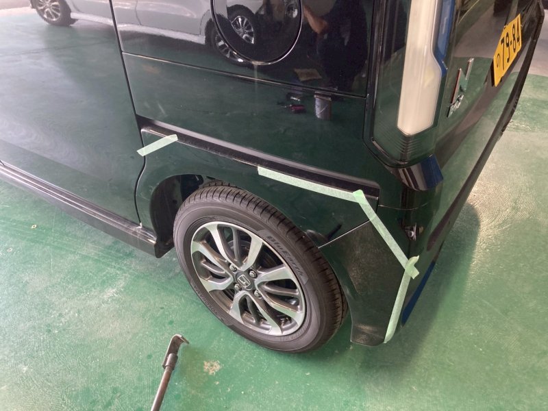 愛知県知立市|N-BOX(ホンダ)のキズ・へこみ直し事例(左側リヤフェンダー周辺鈑金修理になります。)