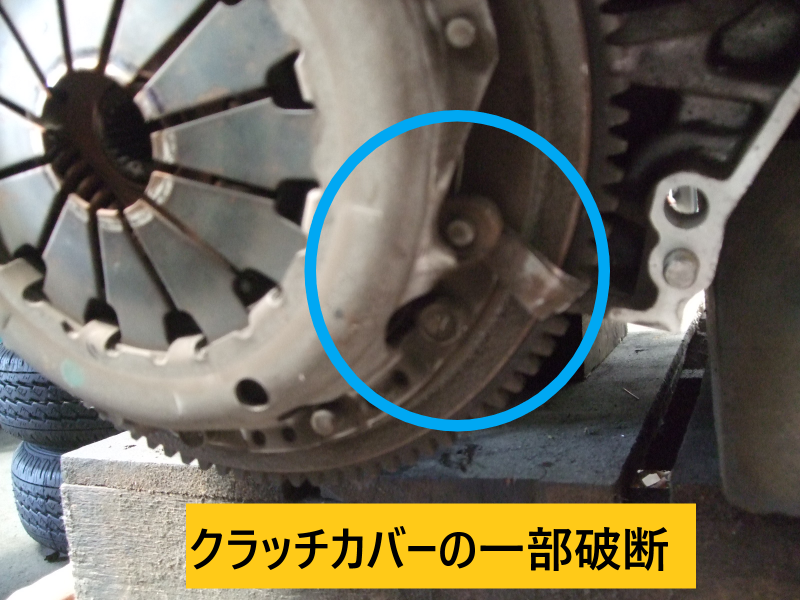 クラッチカバーが破損すると、クラッチが切れなくなったり、踏み込みが重くなったりするが、今回は一部破損だったため、走行不能にならずにすんだ状態でした。