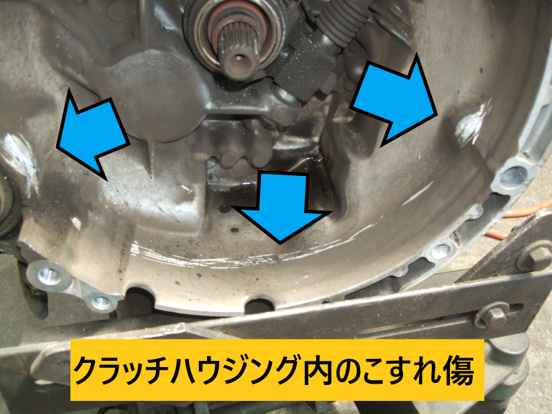 エンジンごと車体から外し、トランスミッションを外し、クラッチの状態を確認すると、クラッチカバーの一部が破損し、その破片とクラッチハウジングが擦れ、異音が発生していることが確認されました。