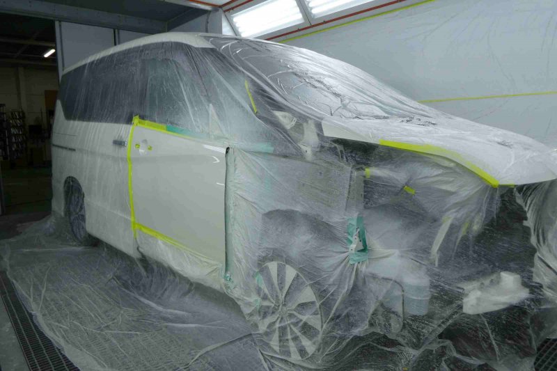 鈑金作業を終えたら塗装作業へ。はじめにサーフェーサーという下地処理剤を塗布。サーフェーサーは塗料の食いつきを良くする塗装時の必須アイテムです。カラーは3コートパール色なので、まずはベースカラーを薄く何度も重ねて、続けてパール色を塗装しボディの色に近づけます。パール塗装を終えたら、最後にトップコートの役割を果たすクリア塗装をして塗装作業完了です。