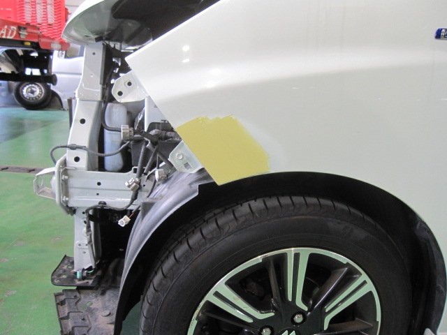スズキ ソリオバンディットのフロントフェンダー、フロントバンパーの鈑金塗装(キズヘコミ修理)が完了しました。