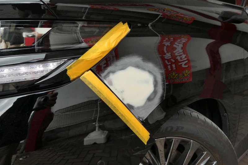 左フロントフェンダーとフロントバンパーの左側にかけてキズを伴なう小さなヘコミがあり、いつの間にかキズヘコミがあったとのことで、気になるから綺麗に直してほしいとの要望です。