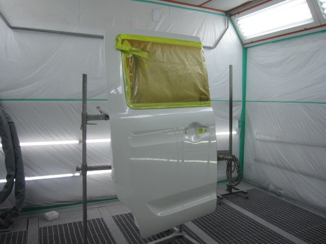 取り外したリアドアも色合わせのため車体カラーに合わせて塗装をし、次にクォーターパネルも同時に塗装します。カラーは3コートパール色なので、まずはベースカラーを薄く何度も重ねて、続けてパール色を塗装しボディの色に近づけます。パール塗装を終えたら、最後にトップコートの役割を果たすクリア塗装をして塗装作業完了です。