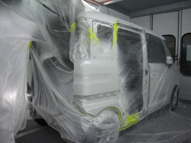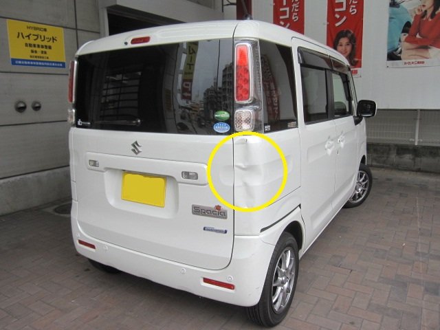 大阪市平野区にお住まいのお客様より、スズキ スペーシアのクォーターパネルの鈑金塗装(キズ・ヘコミ修理)のご依頼をいただきました。