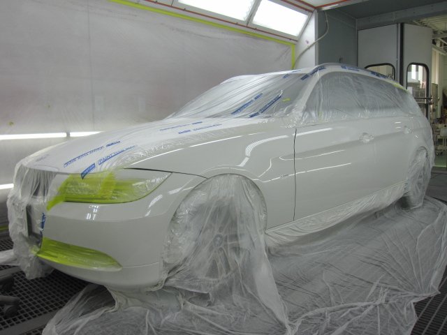 BMW 320 ツーリングのフロントバンパー・フロントフェンダー・フロントドア・リアドア・クォーターパネルのキズヘコミ修理が完了いたしました。