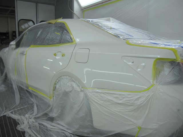 今回は左クォーターパネルのヘコミが大きいため、色の差が出ないように左のリアドアも塗装致します。