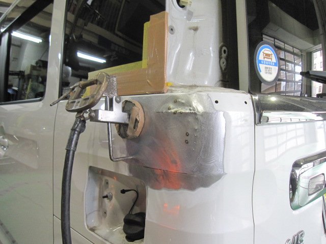 まずキズ・ヘコミ周りの塗装膜を剥離し、凹み、変形部分をスタッド溶接機を用いて引き出し鈑金しています。引き出し鈑金の後、今度はパテにて形成していきます。