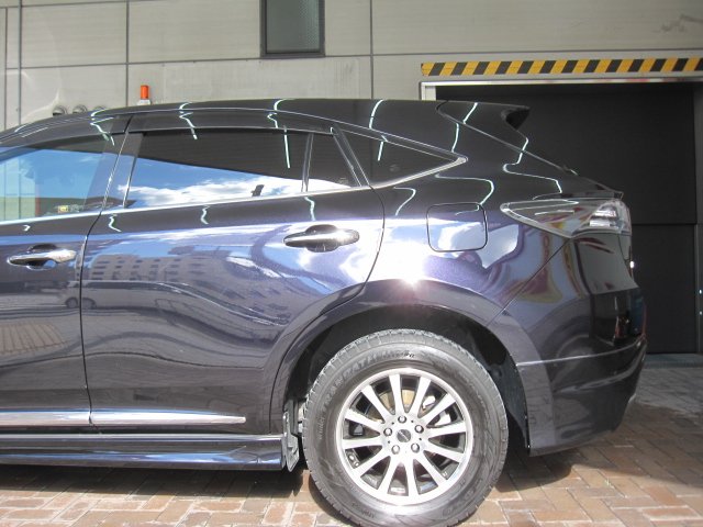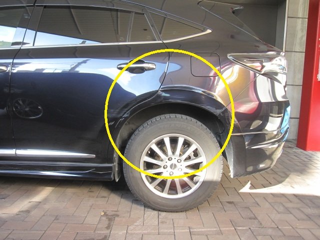 大阪市平野区にお住まいのお客様より、トヨタ ハリアーの左リアドア・クォーターパネルの鈑金塗装(キズヘコミ修理)のご依頼をいただきました。