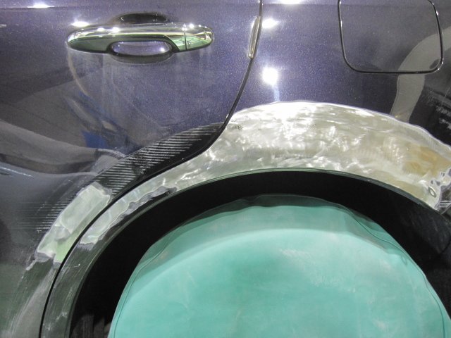 広範囲で中側に入り込んでるので、まず全体に引き出していきます。数時間に及ぶパネルの引き出し作業の次は、パテにて形成していきます。パテも数種類使います。最初は粗い目のパテで形成していき徐々に細かい目のパテを使用して綺麗に形成します。