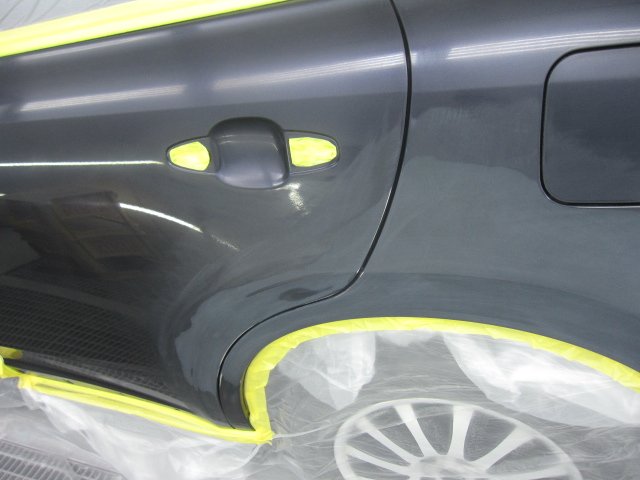 リアドア・クォーターパネルを車体カラーに合わせて塗装を行います。カラーはムラサキ系の2コートカラーなので、まずはベースカラーを薄く何度も重ねて、続けてトップコートの役割を果たすクリア塗装をして塗装作業完了です。