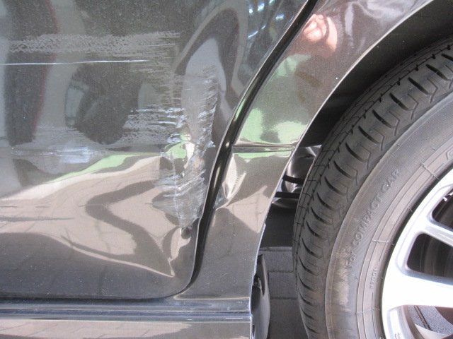 まずはリアドアを取り外します。クォーターパネルをは損傷が小さいので、交換ではなく鈑金塗装(キズ・ヘコミ修理)で修理いたします。クォーターパネルのヘコミを裏・表から叩いて整形し、傷表面のデコボコをなくすために削ります。続いて新品リアドアパネルを一旦取付けし、隙間等をチェックします。