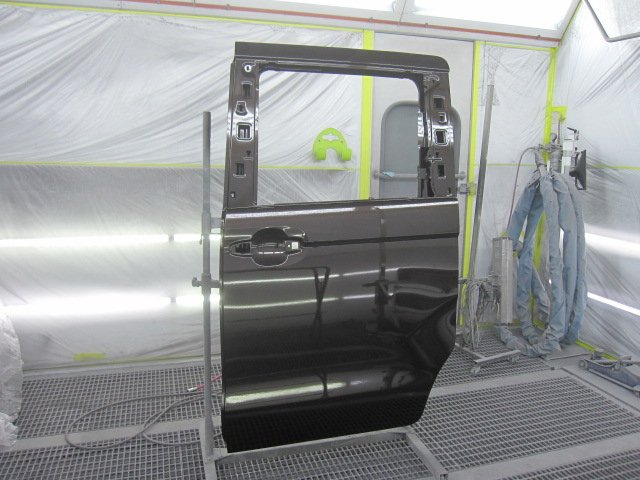 新品パネルのリアドアを車体カラーに合わせて塗装をし、次にクォーターパネルと色合わせのためにフロントドアも同時に塗装します。カラーはブラウン系のメタリック色なので、まずはベースカラーを薄く何度も重ねて、続けてトップコートの役割を果たすクリア塗装をして塗装作業完了です。