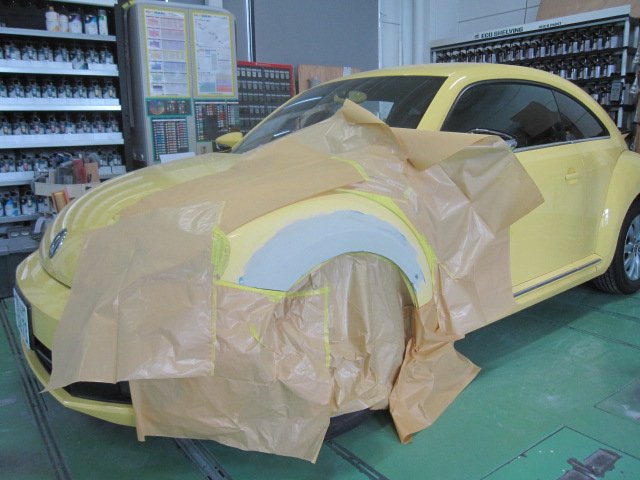 ワーゲン ビートルのフロントフェンダーの鈑金塗装(キズヘコミ修理)が完了しました。