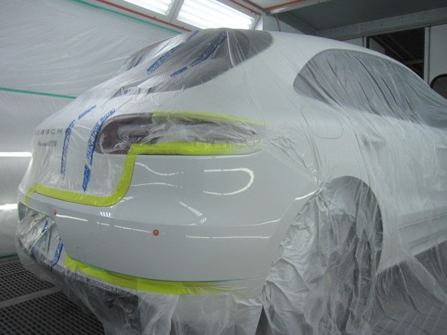 ポルシェ マカンのリアバンパーの鈑金塗装(キズヘコミ修理)が完了です。