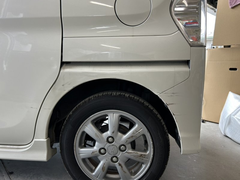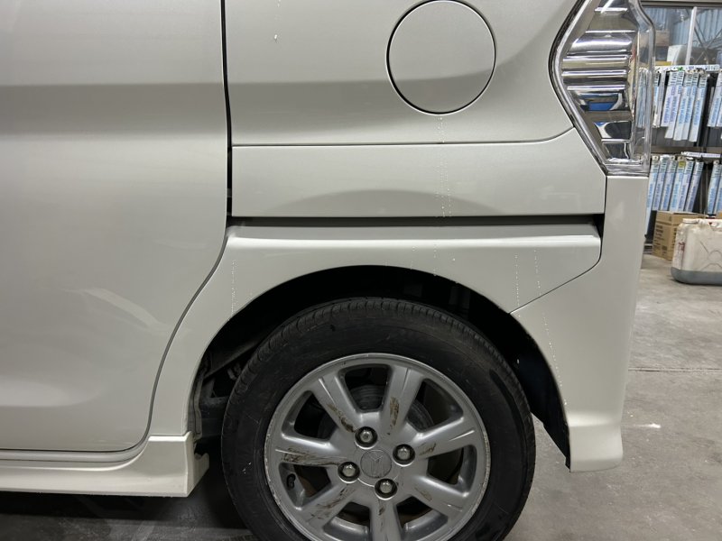 千葉県千葉市緑区 タント 左後ろ リアドア クオーターパネル リアバンパー ホイル タイヤキズ・へこみ直し事例