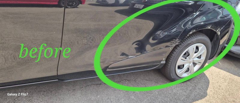 | 修理の箇所・サービス内容 | ・左側後ろドアからタイヤ上にかけてのキズへこみ |