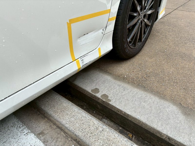 お車はトヨタ・MIRAI。自損事故により、右フロントフェンダーとドアにへこみ、ステップとバンパーにえぐれが確認できました。見た目だけでなく、放置すると違和感が残る状態です。