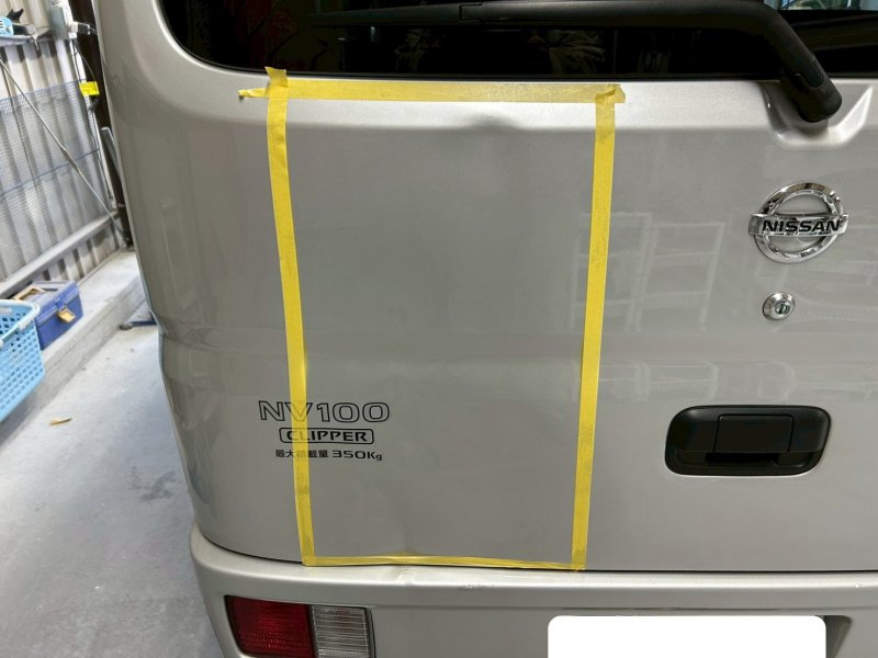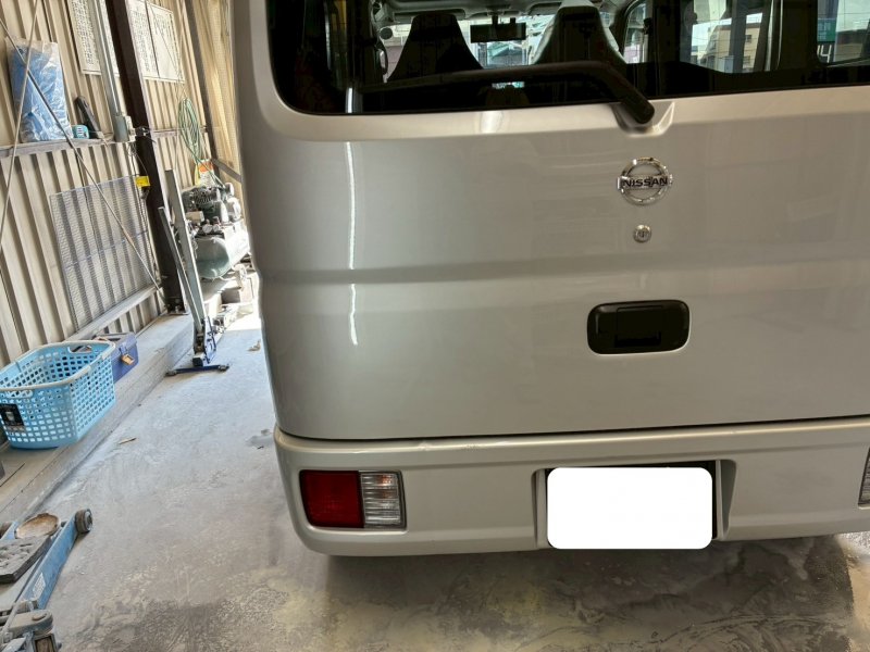 日産・NT100クリッパーのハッチバック自損によるへこみ修理を行いました。損傷はハッチバックの中央部に大きな凹みと軽いキズがあり、目立つ状態でした。