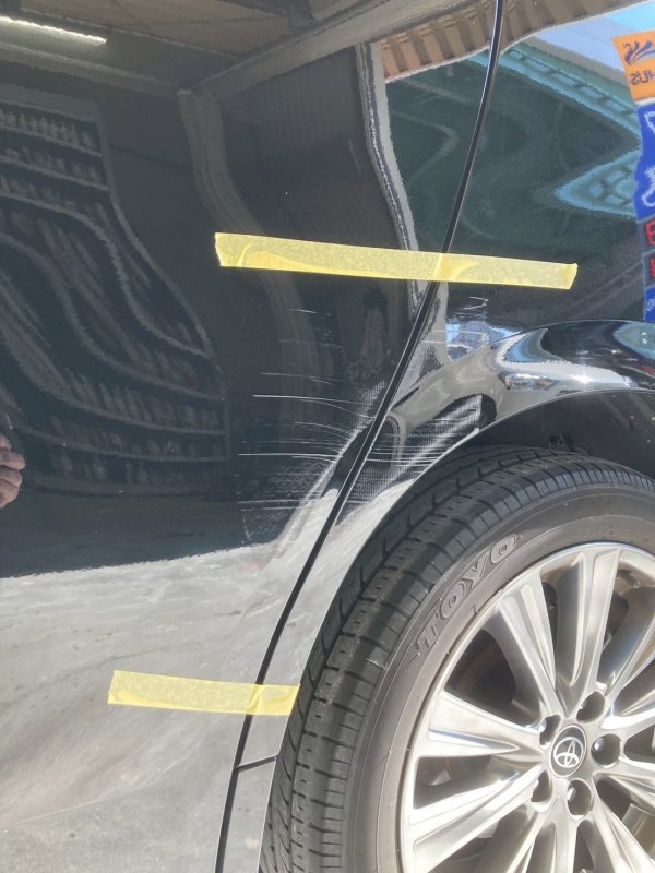 駐車時の壁へ擦ってしまい、ドアからフェンダーにかけて長めのすり傷が入っていました。へこみはなく、塗装表面のキズ修復を中心に作業しました。