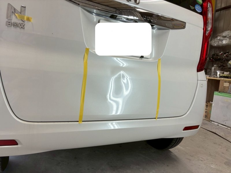 バックの際に壁へ接触し、ハッチバック部分に目立つへこみができてしまったとのこと。ディーラーでは交換を提案されたそうですが、当店では鈑金塗装修理で対応いたしました。専用工具で金属を丁寧に引き出し、パネル形状を正確に復元。その後、表面を滑らかに整えてから塗装工程へ。塗料は新車時のレシピではなく、現在の車体色に合わせて調色し、修理箇所を自然にぼかしました。