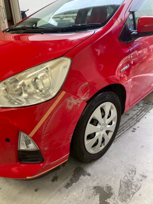 今回はトヨタ・アクアの左フロントドアとフロントバンパー修理をご紹介します。駐車時に壁へ擦ってしまい、ドアにはすりキズ、バンパーにはえぐれキズがついてしまったとのことでご来店いただきました。