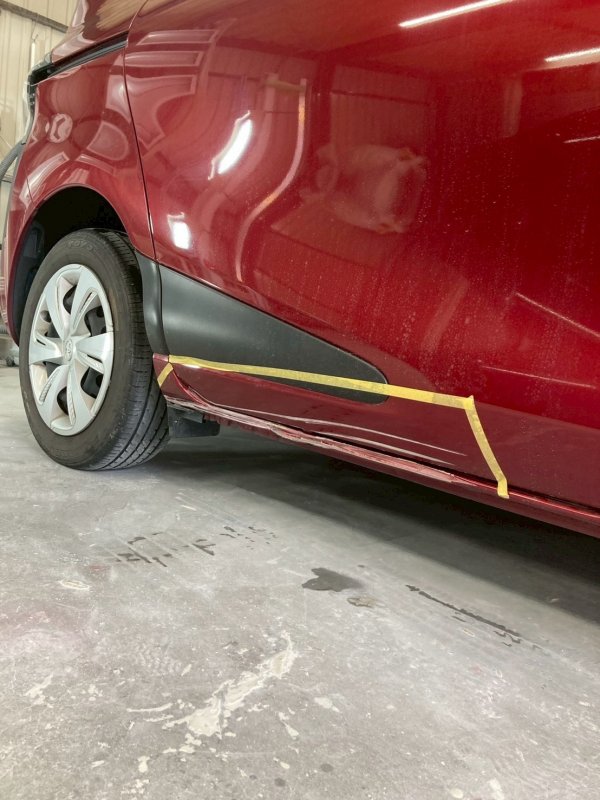 今回はトヨタ・シエンタの右リアドアとステップ修理をご紹介します。駐車時に縁石へ接触し、ドアにはすりキズ、ステップにはへこみができてしまったとのことでご入庫いただきました。