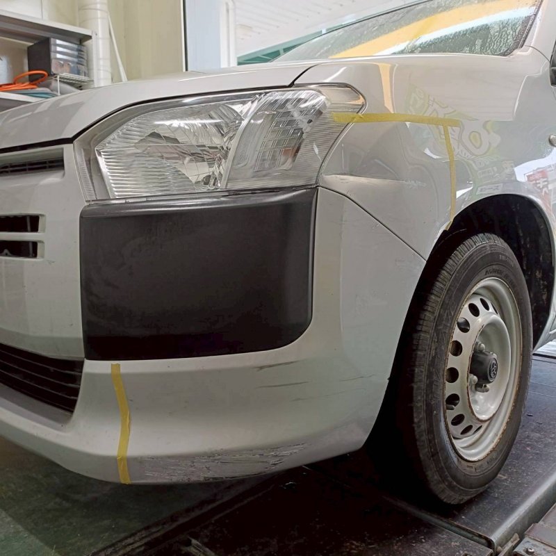 今回はトヨタ・プロボックスバンの左フロントフェンダーとフロントバンパーの修理をご紹介します。狭い道で壁に接触し、フェンダーにへこみ、バンパーにはえぐれキズができてしまったとのことでご入庫いただきました。